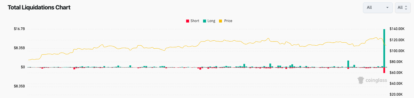 CoinGlass'tan elde edilen veriler, 24 saatlik tasfiyelerin yaklaşık 20 milyar dolara ulaştığını ve uzun pozisyonların büyük çoğunluğu oluşturduğunu gösteriyor.