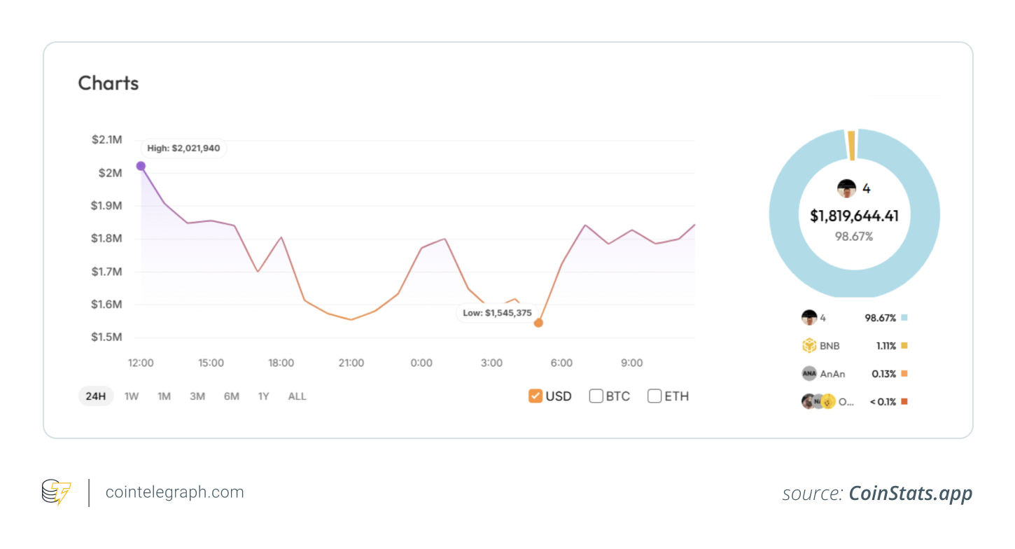 Zincir içi veriler yalnızca hafif bir kar elde edildiğini gösteriyor. Adres, portföyünün %98'inden fazlasını 4'te tuttu. İlk yükselişin ardından 1,88 milyon dolar civarında kaldı. Bu, büyük bir satışta tüm pozisyonun riske atılması ve momentumun devam etmesi durumunda maksimum kar potansiyeli sağlanması anlamına geliyordu.